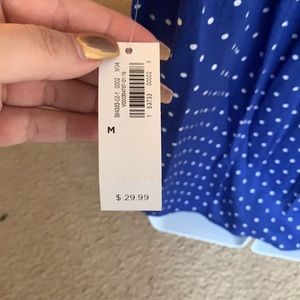Blue button down short sleeved blouse with white polka dots. Never worn.