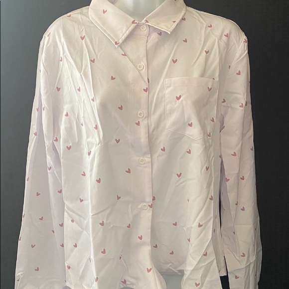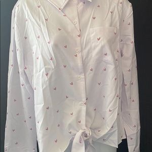 Long sleeved white Chiffon button down with lovely pink heart throughout. Ties at the bottom