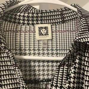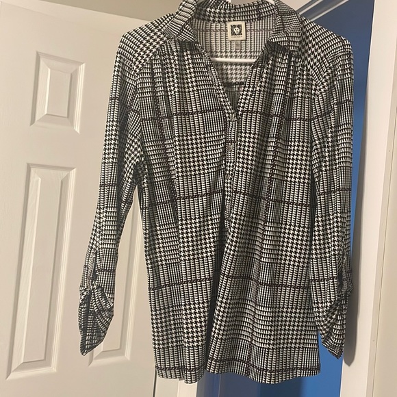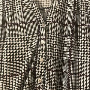 Dressy blouse, very flattering. Purple, black and white pattern. Has silver buttons. Perfect for the office or night out