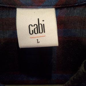 Black button down CABI blouse with blue and red plaid pattern. Pretty lower hem adds a feminine touch. Very comfortable and flowy. Worn once - excellent condition. This blouse is not purple. The pictures would not show the true color so I tried to attach a photo of the pattern. Size L.