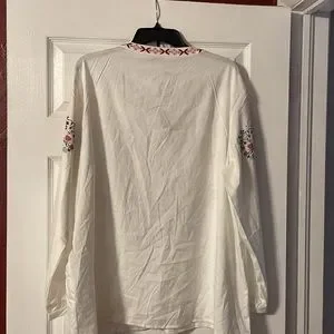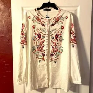 Button down embroidery “look” blouse. Hidden buttons all the way down but could be worn open as a jacket. Lightweight material, new with tags, never worn.