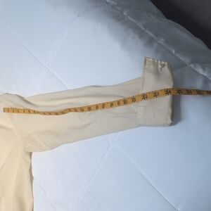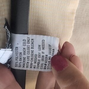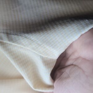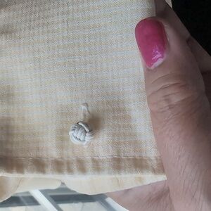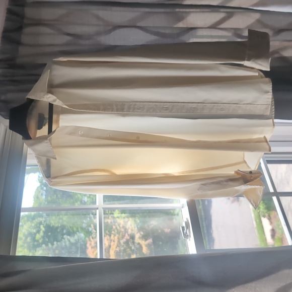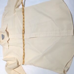 This is a buttery yellow minuscule yellow and white checkered shirt. button down collared long sleeve French cuffs loose fitting or not wear it buttoned closed or not...wear the sleeves down or not. you're the boss! This is great over a white tank top or worn by itself with white pants or a pair of jeans or a white skirt. I loved this shirt but have put on some weight unfortunately. non-smoking non-pet home.