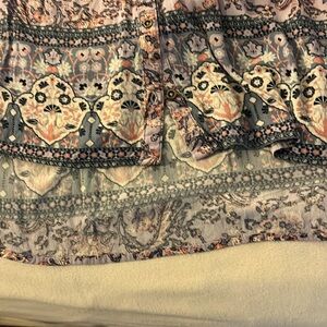 Long sleeve light weighty blouse. High low hemline, gathered top and loose body. Very soft. 100% rayon. Paisley and floral colors