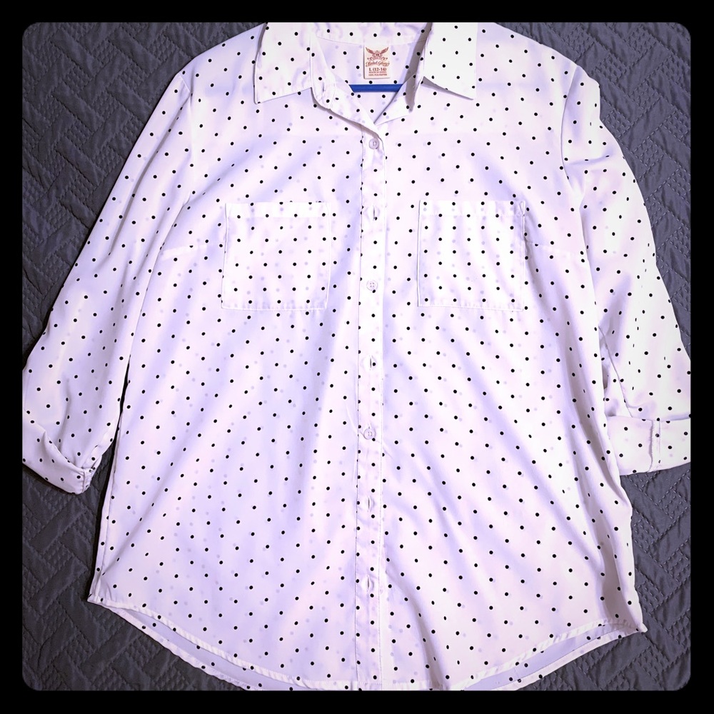 Comfortable and stylish button down blouse with black polka dots and buttoned sleeves. For warmer weather, the sleeves can be folded and buttoned to 3/4 length.