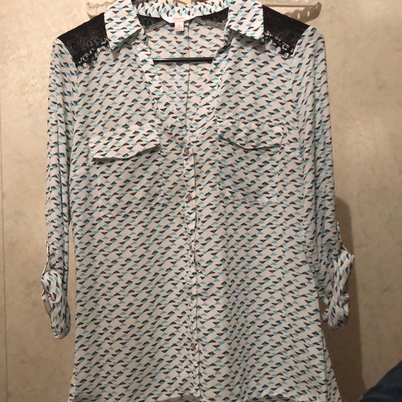 Button down blouse with blue and black triangle pattern