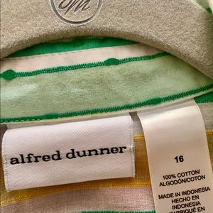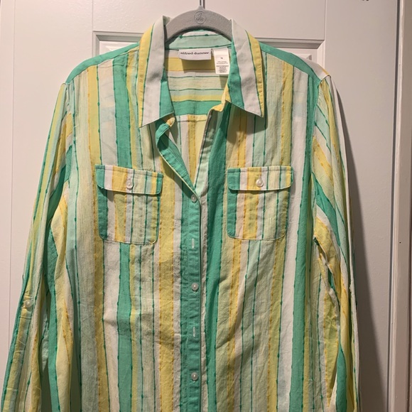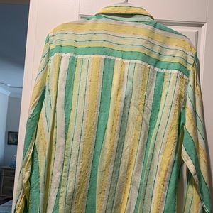 Nice button down striped collared shirt. Beautiful springs colors of mint green, yellow and white. Long sleeved which turn up to be buttoned up with buttons on both sleeves. Longer style can be worn over another shirt.