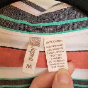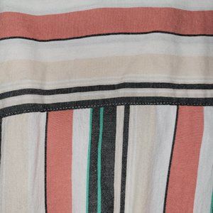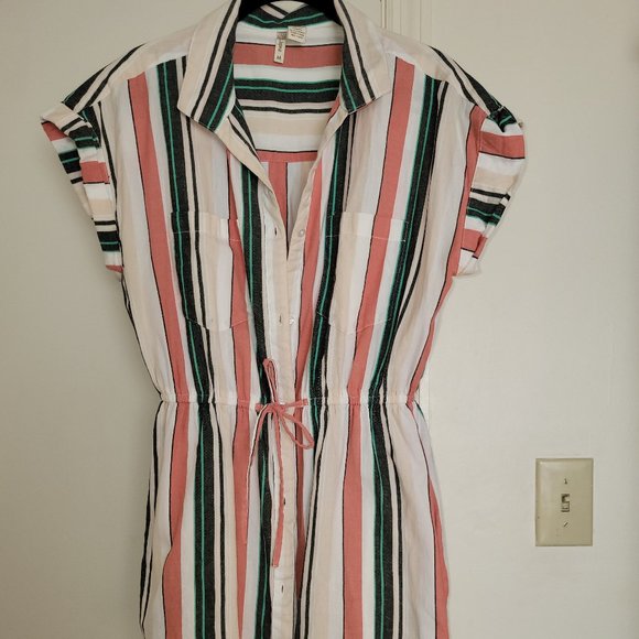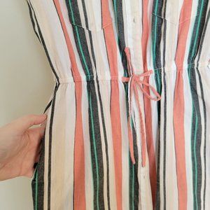 Japna button down striped cotton dress. Cinched waist. Side pockets. Back of dress slightly lower than the front.