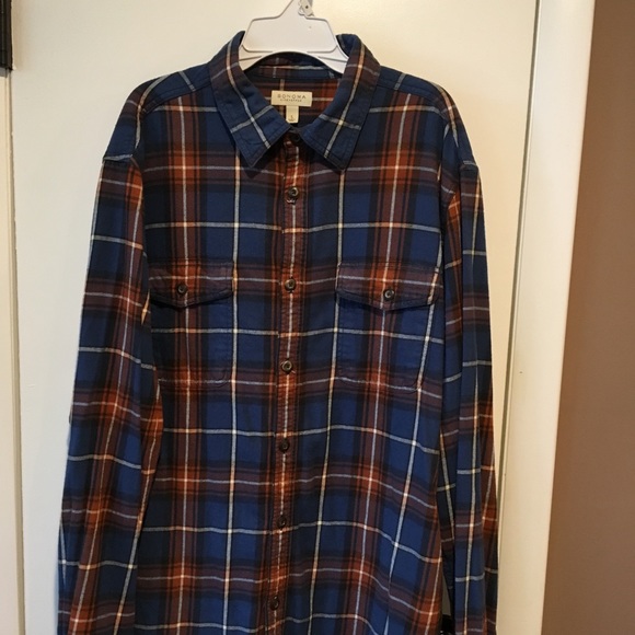 Blue and orange flannel. Only been worn a few times. Looks and feels brand new