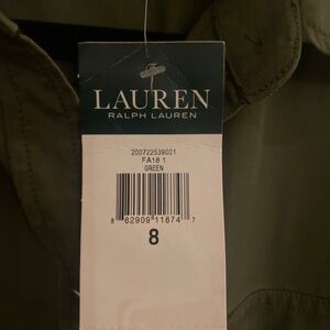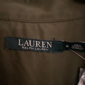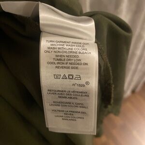 Dark green button down dress. Length is midi or maxi depending on height. Has a tie waste belt in matching fabric. Sleeves have a roll tab design and are approximately 3/4 when unrolled.