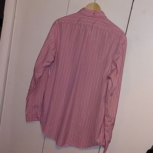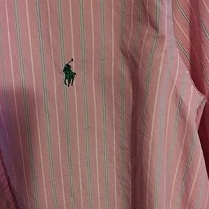 Pink, blue and white pin stripes, only thing wrong with this shirt is the broken button and the little whole under the collar, both are shown in photos,