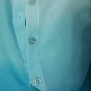 Blue ombre button down sheer shirt, ties at bottom. Small stain shown in picture