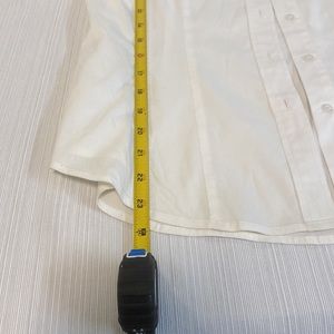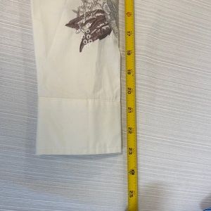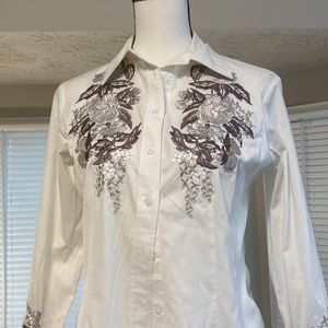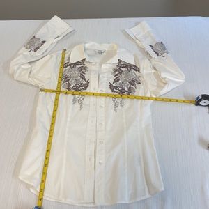 White button down shirt with embroidered roses. Pre-owned Size XS. Incredible! Many possibilities: western is only one. Colors: white, bronze, and silver.