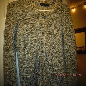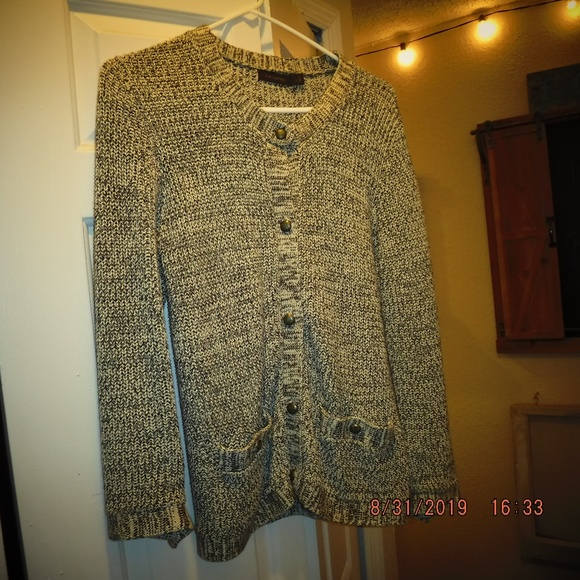 Extremely comfortable and nearly brand new. Not too heavy, great for "around the house". Button down with over sized black buttons as well as closed pockets in front with same large buttons.