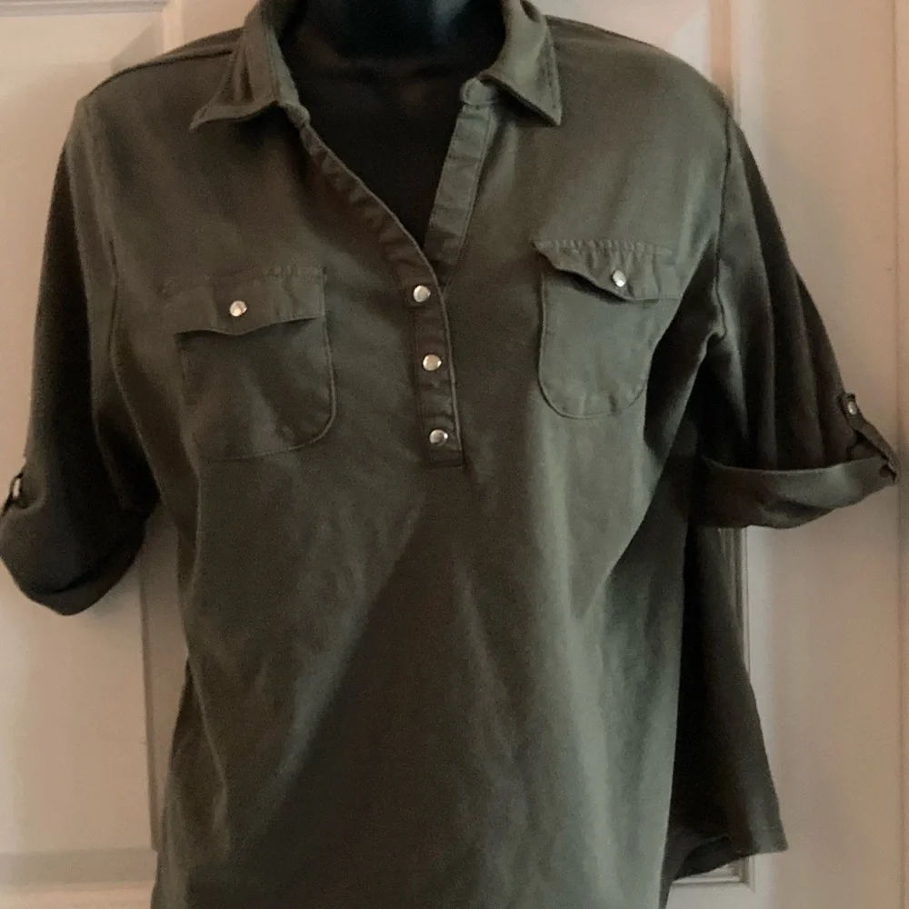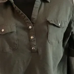 Very soft gray tee with button accents. Short sleeved. Can be worn casual or business casual. Excellent condition. Worn once or twice only.
