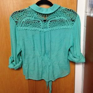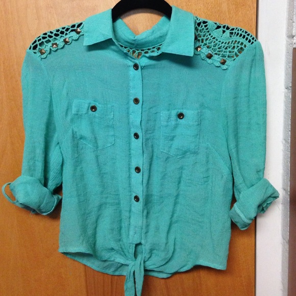 Green button down with lace back, studs, and tie