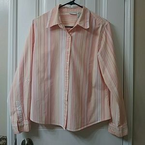 Peach, yellow, pink and white striped button down top, sleeves can be rolled up and buttoned, size L, looks pretty with the coral scarf also for sale in my closet, sold separately 👍