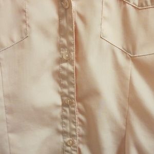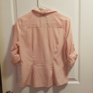 Button down, light pink, top. Rolled up sleeves. Casual top great for work or a night out!