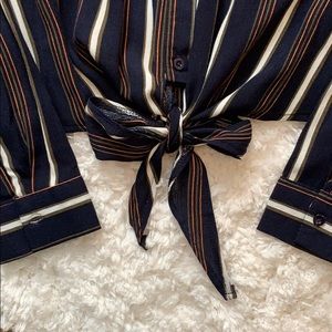 Navy, rust, olive green and white vertical striped top. Bought from a local boutique.