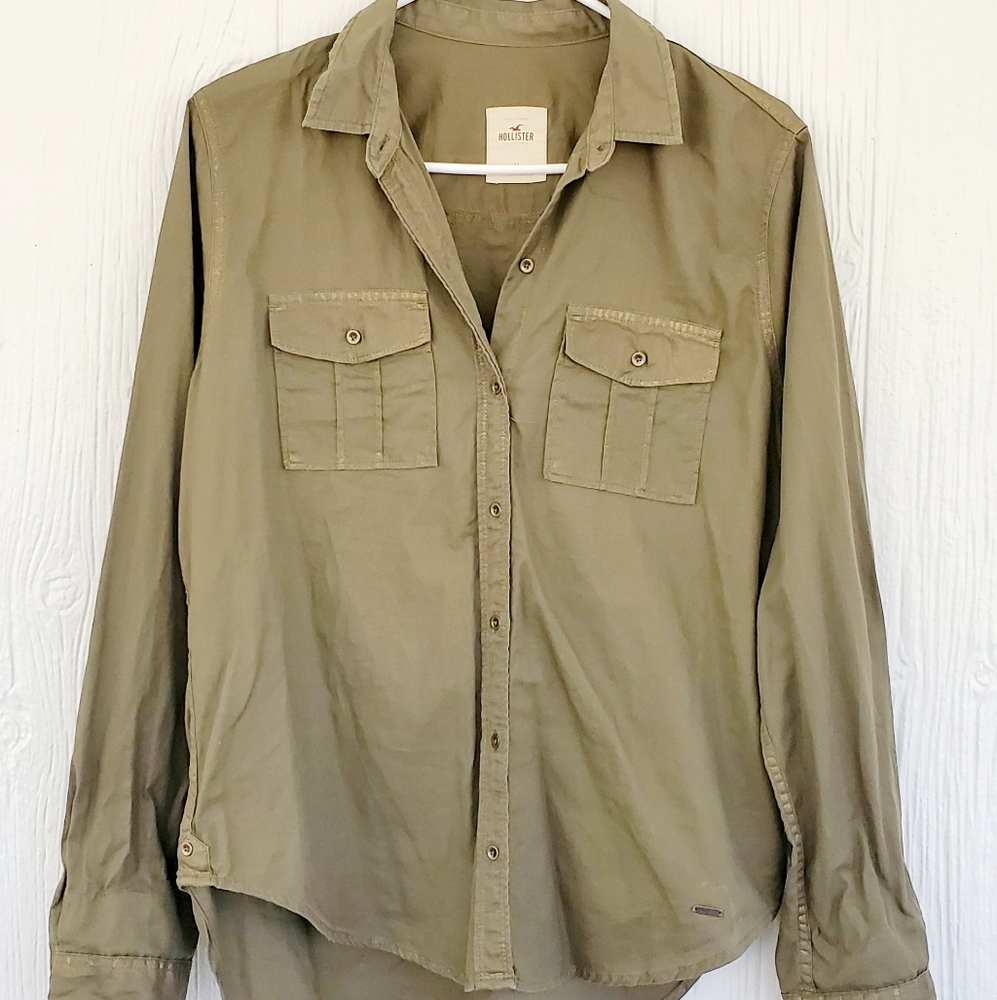 Hollister button down green top. It's hard to show in pictures but has a gold tone in areas. Small discoloration around tag as pictured.