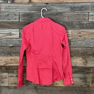 Dark salmony pink button up from Banana Republic. It is clearly wrinkled and I will be having it hanging from now on to helpfully help settle some of those. It is also a stretch fit. In good condition.
