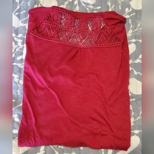 redish button down dressy top with lacy on the back top. sleeve length is adjustable.