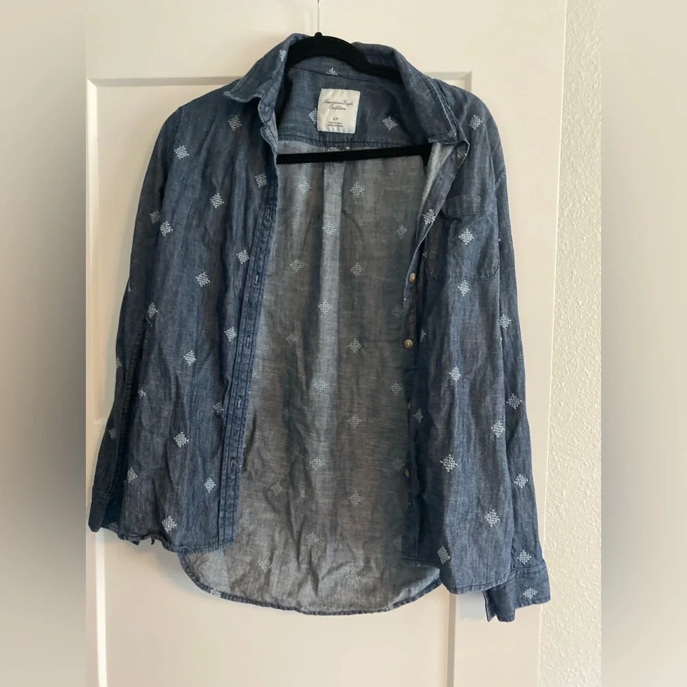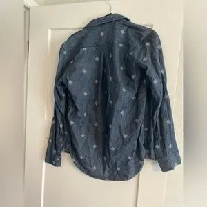 This is a dark denim colored button-down shirt with lighter blue colored stitching in a diamond shaped design. It’s in great condition.