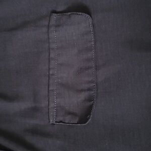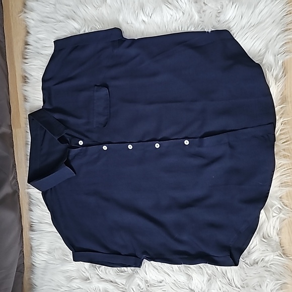 Navy blue, button down, cap sleeve with cuffs, faux flap pocket on left chest, shirtail bottom.