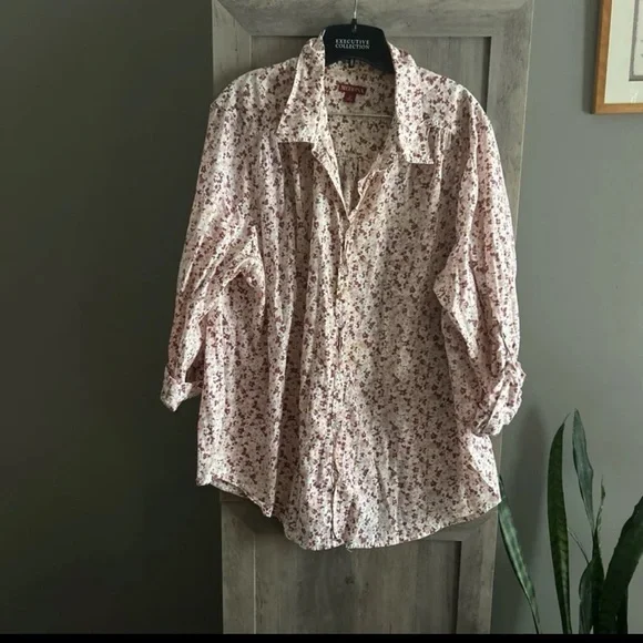 Merona floral button down blouse Roll tab sleeves Size 3X 29” across underarms 30” length Plus size Pink and white floral print