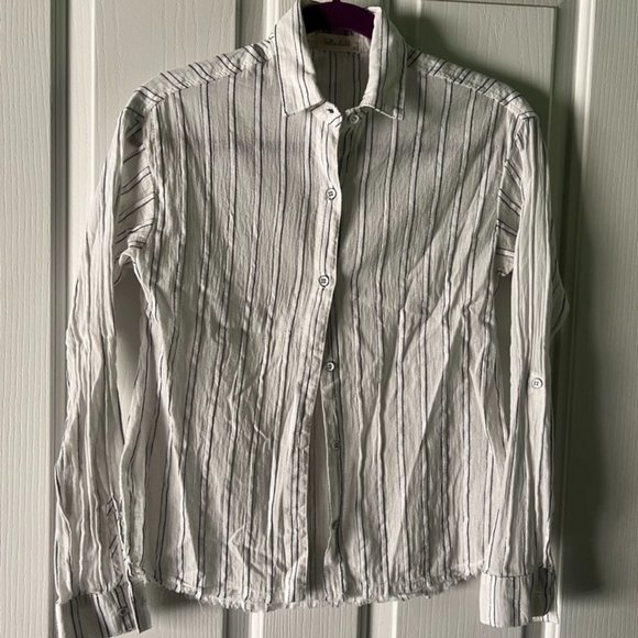 White with black stripes Bella Dahl button down top with raw hem detail.