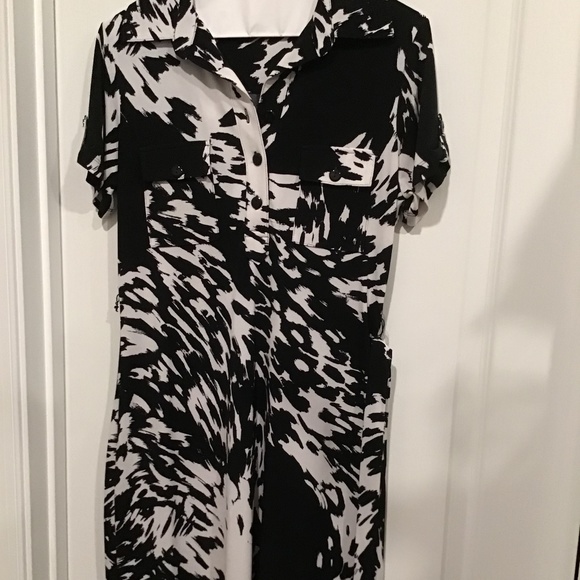 Black and white patterned dress that buttons down with a tie to cinch at waist