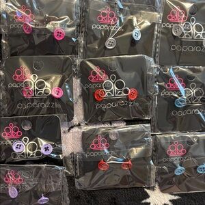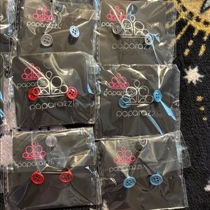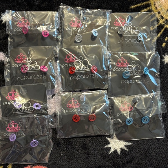 Button earrings. 10 pairs, great for party favors. Pink, red, purple, blue and silver. Never worn.