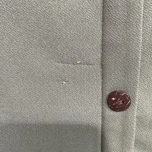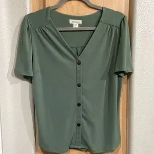 Cute and extremely soft, polyester/spandex tee. Faux buttons on front. Slight pleating details on shoulder/sleeves and back. Small run in fabric on front as shown in photo.