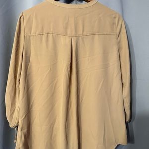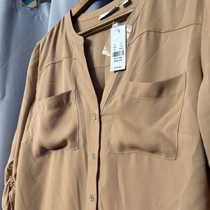 Button front tan blouse with scrunch sleeves and breast pockets.