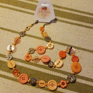 Adorable necklace made from buttons. Colors of peach, melon, tan, brass, orange. Measures approximately 28 inches long. Brand new. Excellent condition.