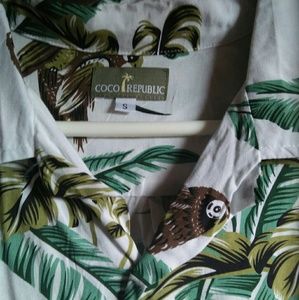 Palm leaves and birds. Tropical. Size S, but can fit M,L,XL depending what country you are from.