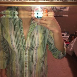 A fun and cool quarter-sleeve button up! It has little color strings in a line as you can see in the picture