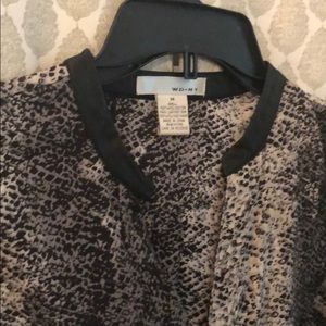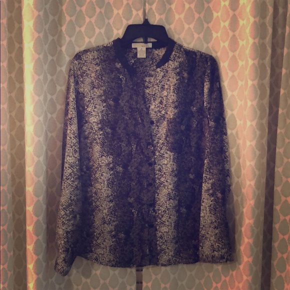 Animal print black, white and grey blouse. Button up with leather collar. Cute with black jeans and pumps!