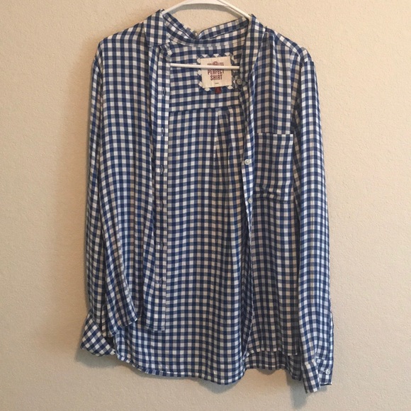 Blue and white checkered button up shirt. Long sleeve. Never worn