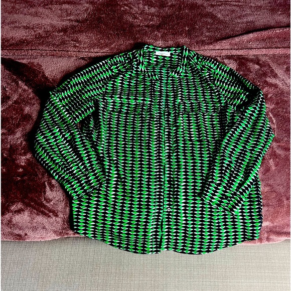 Green and black button up blouse.