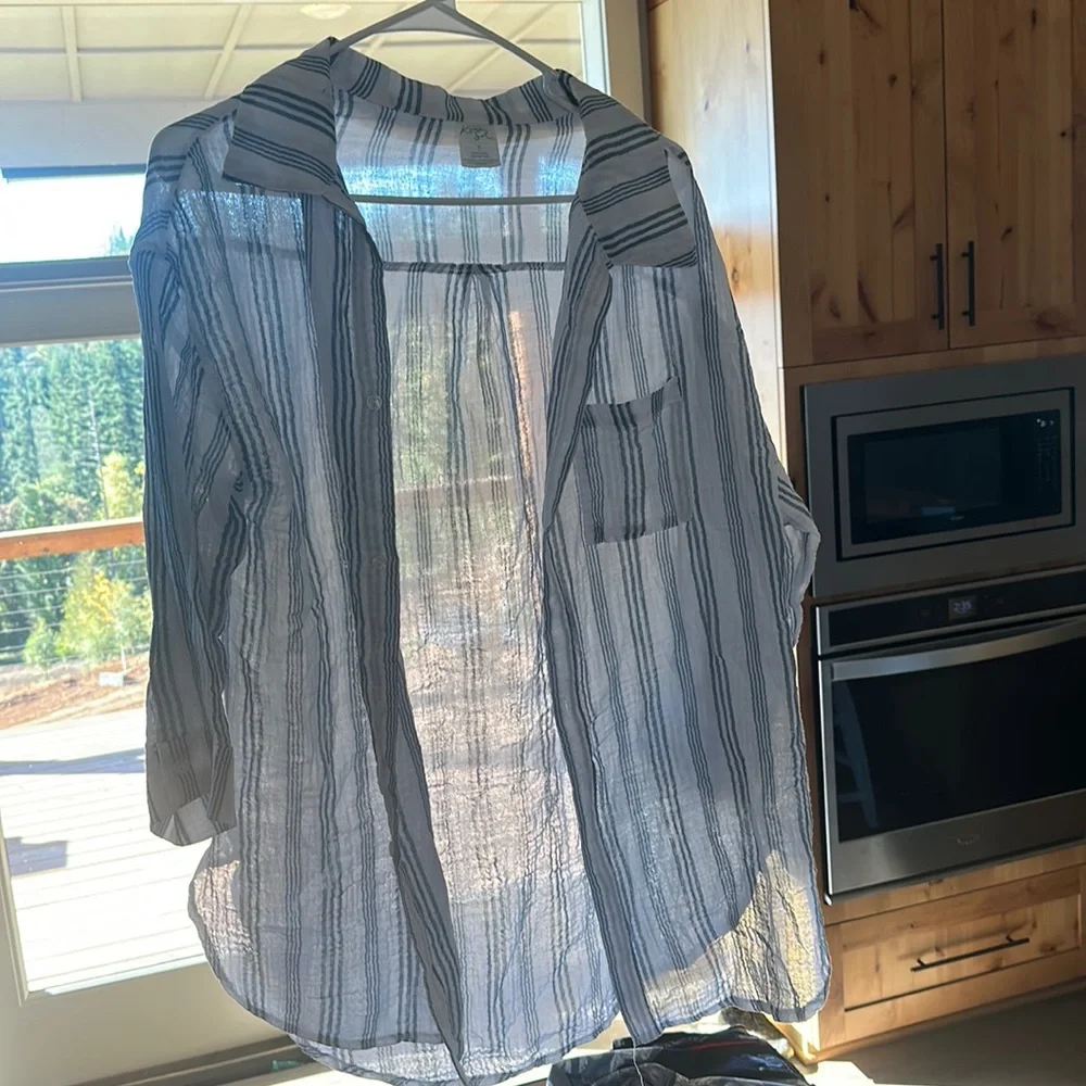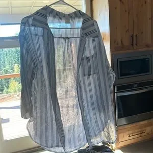 White and blue button shirt, could wear with shirt underneath or buttoned up, never worn, great condition
