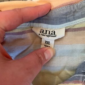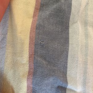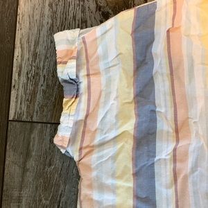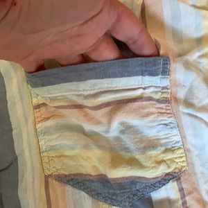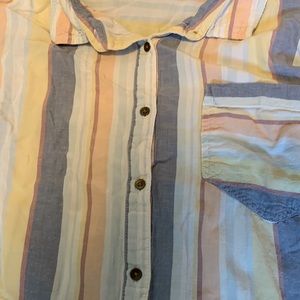 Striped pastel button up tee. Slightly worn and arms cuffs could be ironed smooth again.
