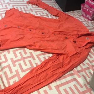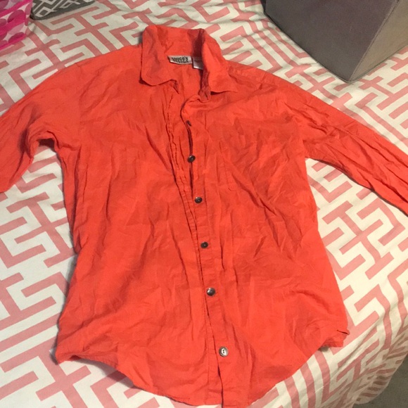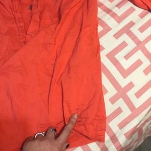 Never worn Orange/red button down blouse real cute (BUT WRINKLEY) small mark on back that probably can be removed with stain cleaner. Too difficult to keep wrinkles out of for me lolol