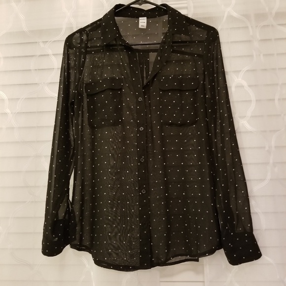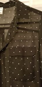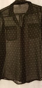 Black button up blouse with small white and gray polka dots. This top is see through but looks super cute with a black camisole underneath. I am super sad to be getting rid of this top. It was one of my favorite work shirts but I have outgrown it. I promise you will love this one!!