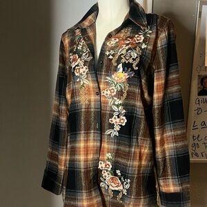 Gorgeous unique embroidered plaid velvet back like jhonny was but better blouse NWT by paparazzi Biz preshrunk copper gold and vibrant rust colors one of a kind