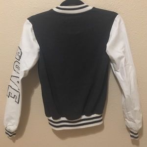 White pleather sleeves with grey blue body. Love written on the side.