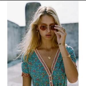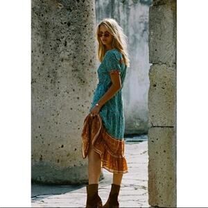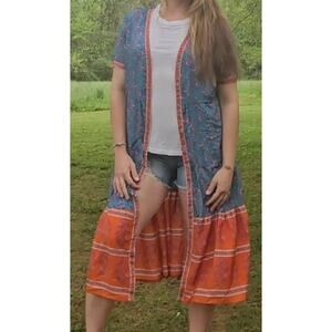 Breezy boho summer style! Short sleeves. V neckline. Button front can be worn closed as a dress or left open as a cardigan layer or cover up. Straight hem. Tiered skirt. Drawstring waist. Midi length. This is a super lightweight and floaty dress. Perfect for a beach or pool trip or vacation!