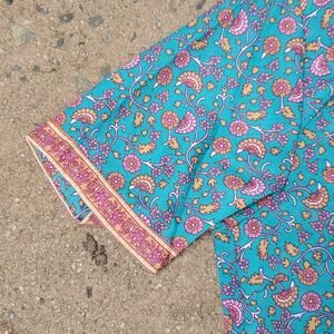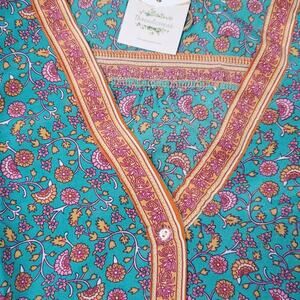 Turquoise blue floral print with contrasting orange print on the hem, cuffs, and along button placket.