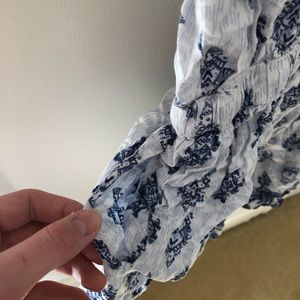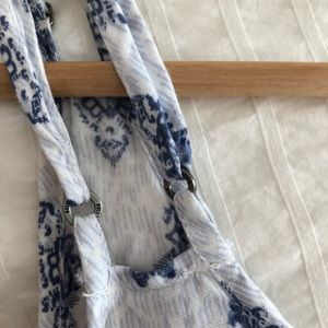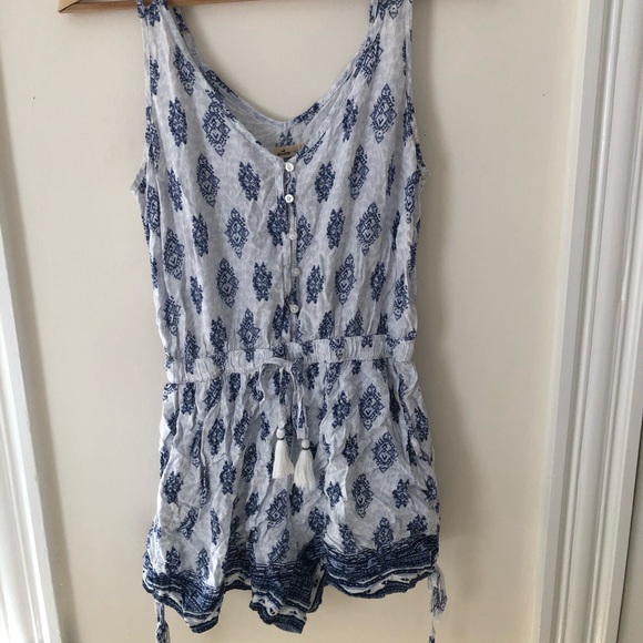 Made with an extremely soft, blue and white patterned material that feels great on your skin. There are 2 straps on each side, both are adjustable. The shorts can be made shorter or longer with adjustable pull-string. The front is buttoned. In good condition. There are pull-string tassels around the waist that can be tightened.
