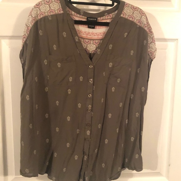 Olive green button up with a cute peach pattern on the shoulders and back.
