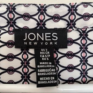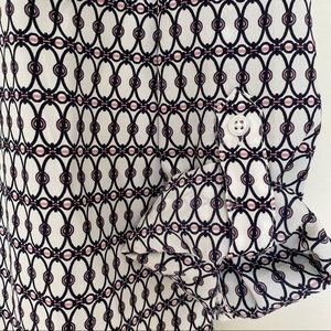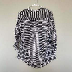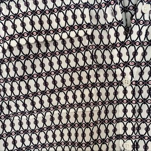 Button up patterned work top with sleeves that roll up and secure with button. White with black and pink print. Two fake front pockets